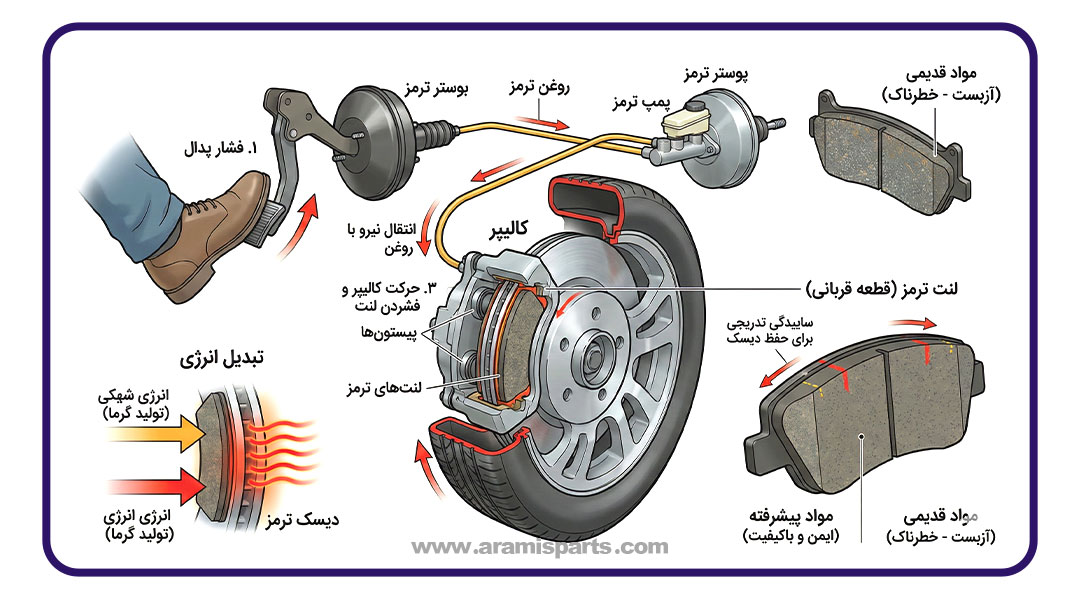 برای درک بهتر زمان تعویض، ابتدا باید بدانیم که لنت چیست و چگونه عمل میکند. لنت ترمز قطعهای است که از یک صفحه فلزی پشتیبان و مواد اصطکاکی که روی آن چسبانده یا پرچ شدهاند، تشکیل شده است. وقتی شما پدال ترمز را فشار میدهید، نیروی هیدرولیک باعث میشود که کالیپر، لنتها را به دو طرف دیسک چرخان فشار دهد. این فشار اصطکاک شدیدی ایجاد میکند که انرژی جنبشی خودرو را به انرژی گرمایی تبدیل کرده و در نهایت باعث توقف خودرو میشود.