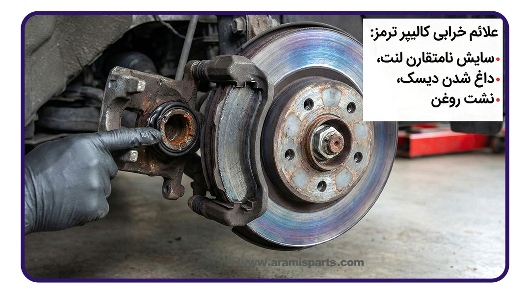 این درگیری دائمی باعث داغ شدن بیش از حد لنت، بوی سوختگی و سایش سریع آن میشود. از دیگر علائم خرابی کالیپر میتوان به کشیده شدن خودرو به یک سمت هنگام ترمزگیری و یا نشت روغن ترمز از اطراف چرخ اشاره کرد. اگر هنگام تعویض لنت متوجه شدید که گردگیر پیستون پاره شده یا پیستون به سختی حرکت میکند، حتماً باید کالیپر سرویس یا تعویض شود؛ در غیر این صورت لنت نو نیز به سرعت از بین خواهد رفت.